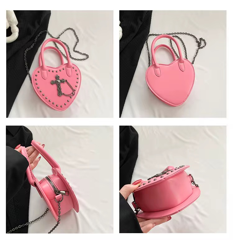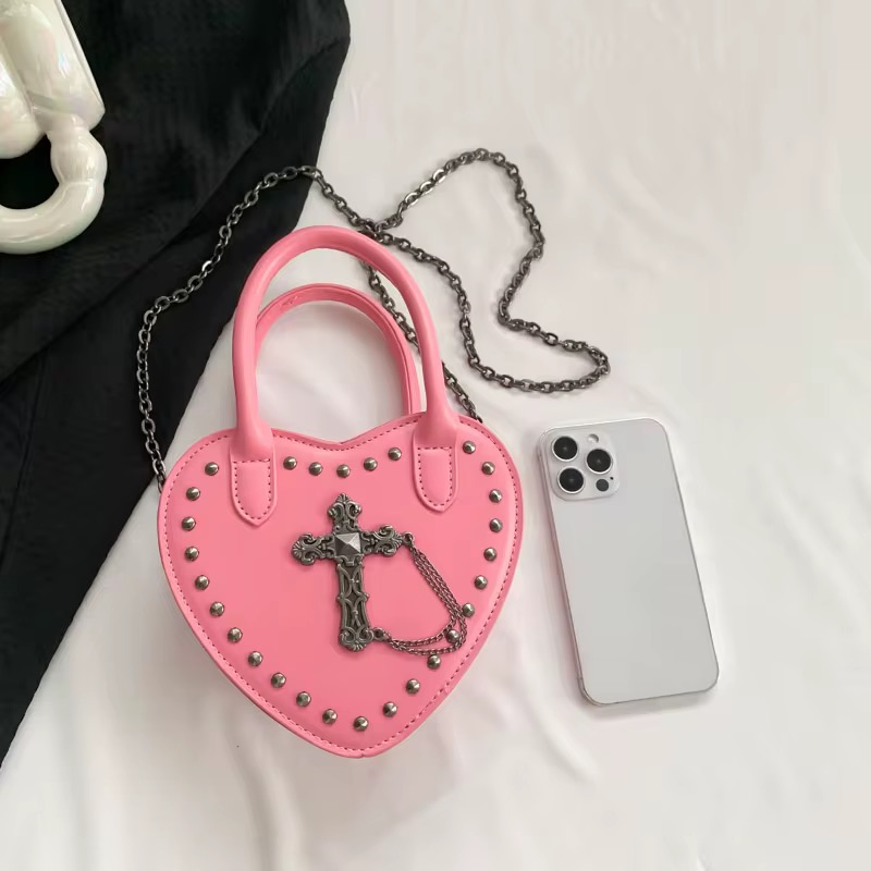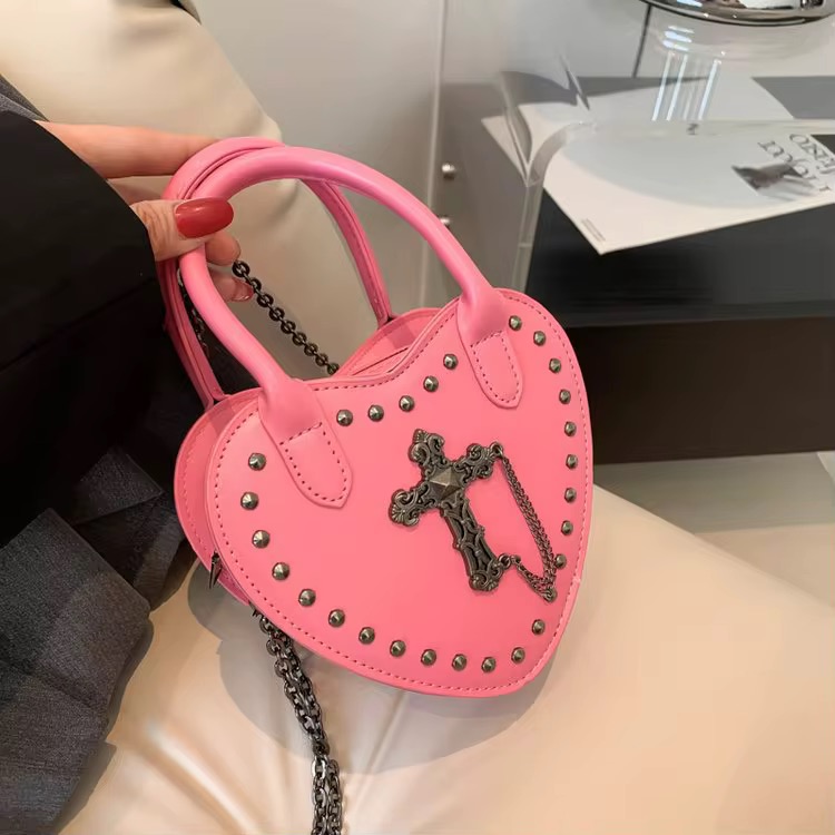 Gothic heart-shaped bag in bold bubblegum pink, pierced with silver studs and chained gothic cross detailing. This piece is made for alt girls who love mixing sugar with steel.